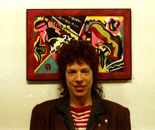 < Karen Garthe [1984] in her “Girl Gang” days, guarding a painting by Valerie Haller in a floating East Village gallery.